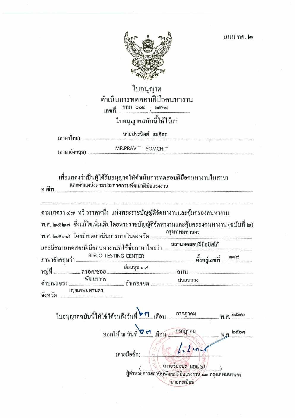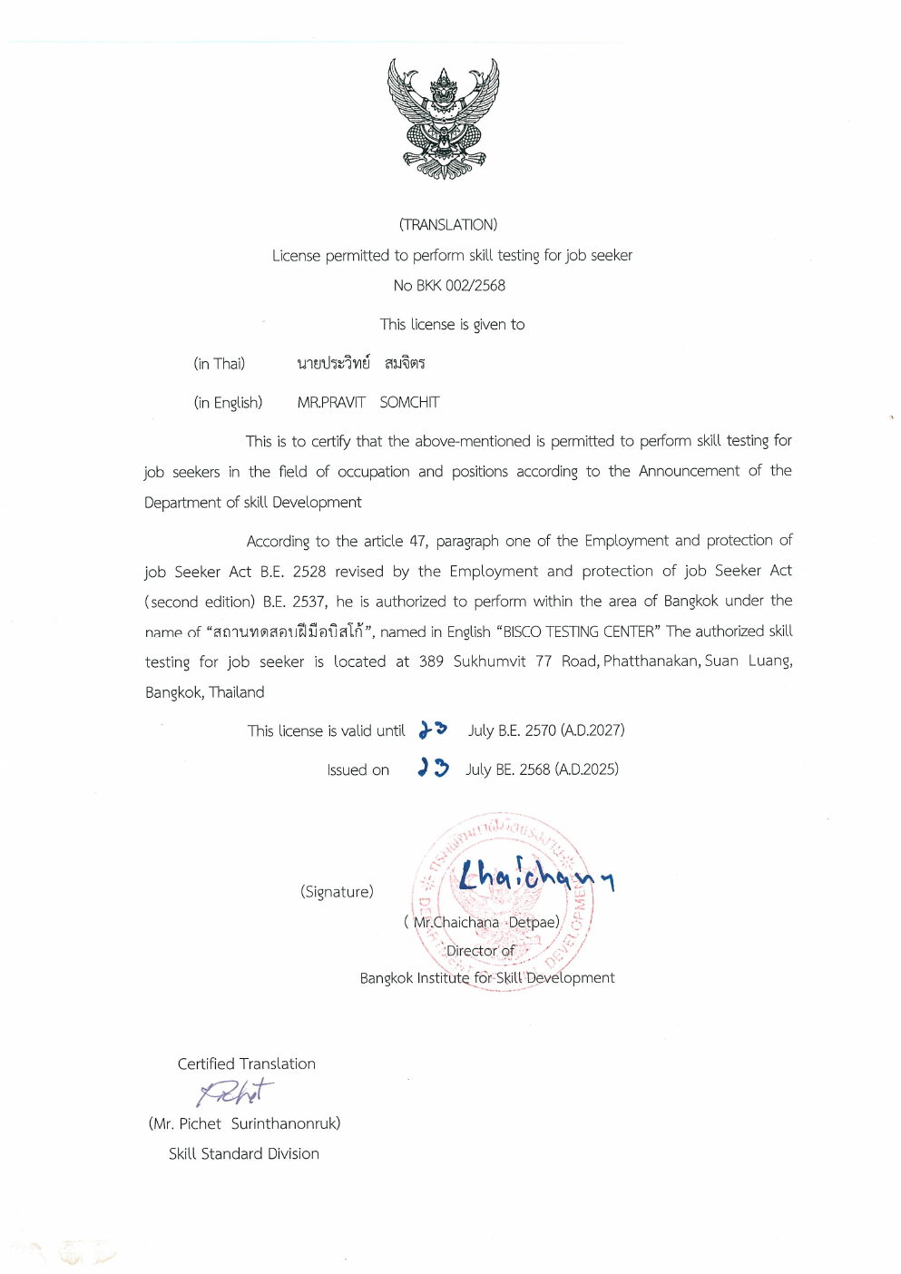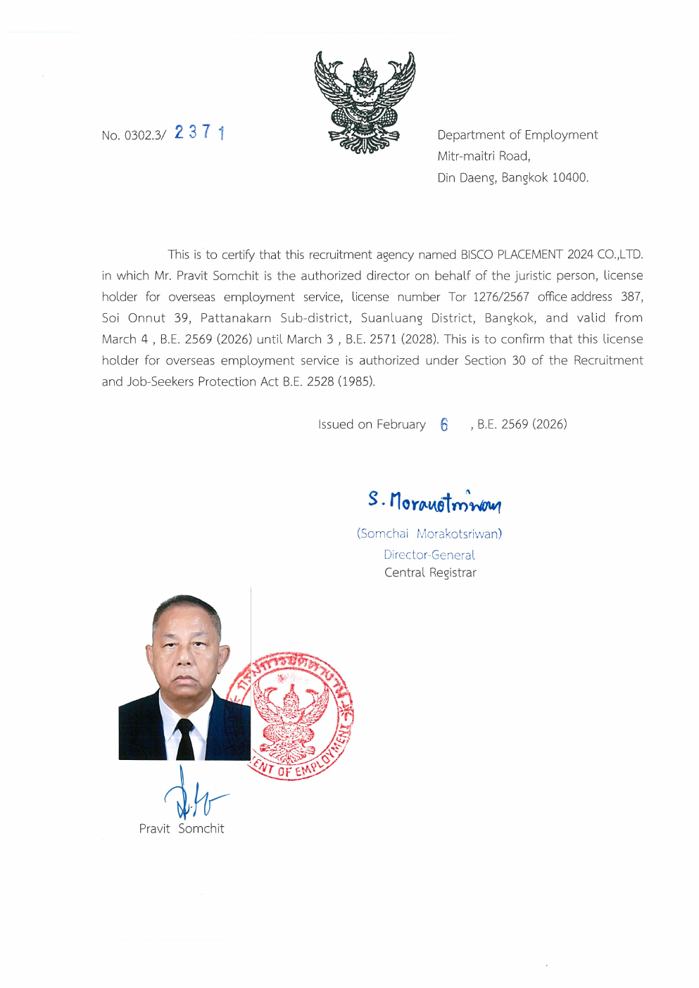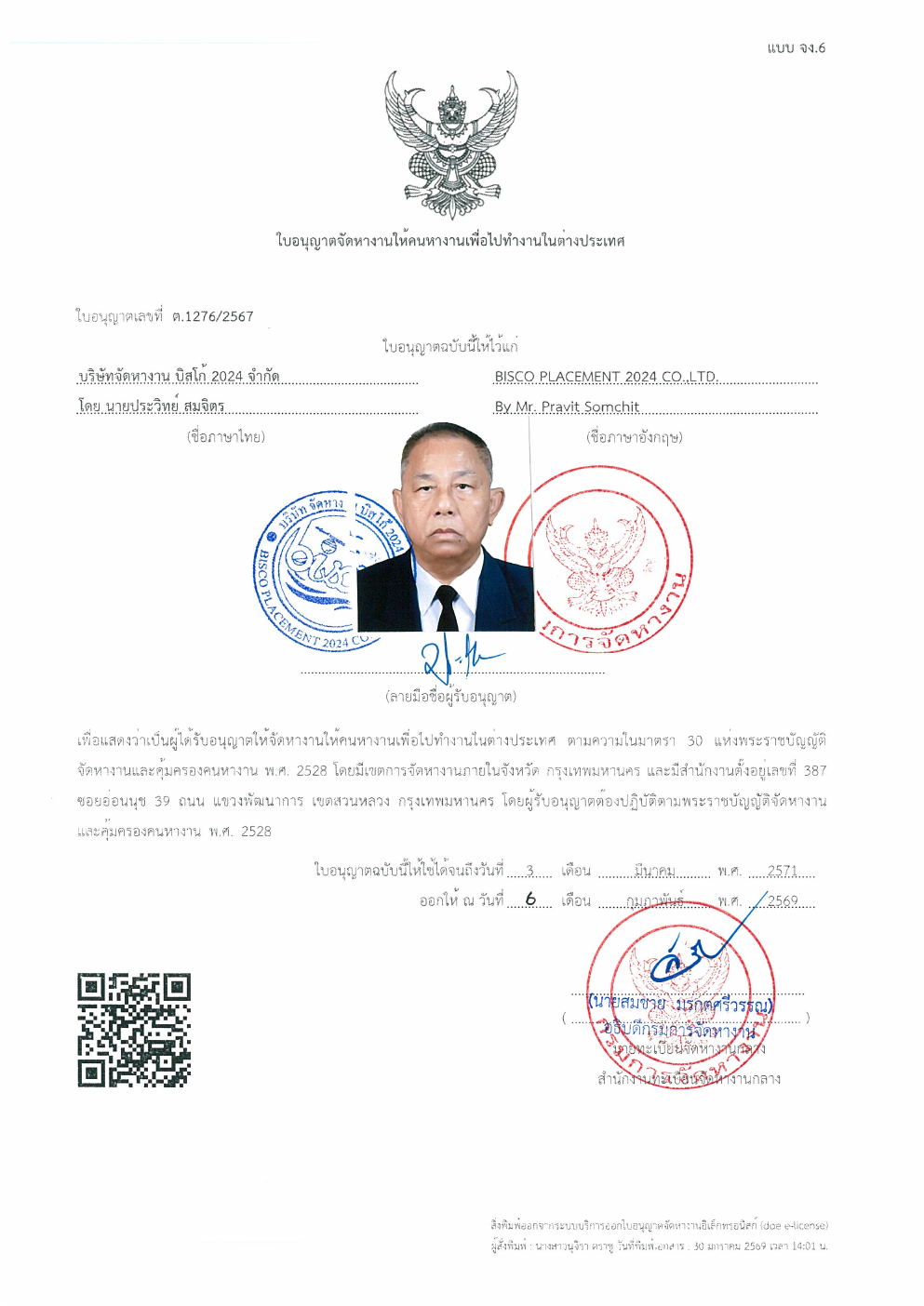 Without an Overseas Employment Agency License from the Thai Department of Employment, dispatching workers abroad is illegal. BISCO has continuously held this license since 1987.